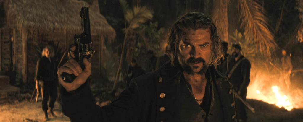 Visually, ‘The Bluff’ leans into grit over spectacle. This is not the flamboyant swashbuckling of Pirates of the Caribbean: The Curse of the Black Pearl. The tone is harsher, bloodier, more survivalist than romantic. After an opening stretch on the water, the story settles into land-based combat caves, traps, shadows, and close-quarters violence. Some sequences are impressively choreographed, particularly a series of trap-laden confrontations that give the film its most playful energy. In these moments, the setting becomes an active participant in the storytelling.